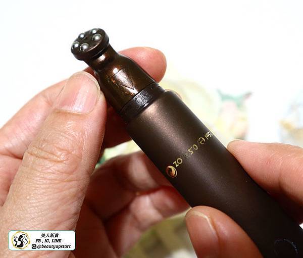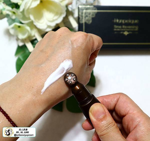 在逆齡眼霜的按摩頭貼心設計了ON與OFF的旋轉頭,可以防止打開眼霜時一不注意擠爆,也能保存好品質,將按摩頭旋轉至ON輕輕擠壓瓶身,眼霜就會從中間的小洞口出來,柔滑豐潤的奶油質感,一抹上就能感受到充分的保濕與滋潤,對我的乾燥眼周算是滋潤度非常夠力,也非常好吸收完全不黏膩,不用擔心會長出巨大負擔的肉芽,眼周肌膚也可以維持健康。